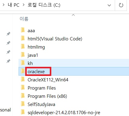 4. 설치가 되었다면 초기설정이 필요 한다. 먼저 c드라이브에 oraclexe가 생성 되었는지 확인한다.