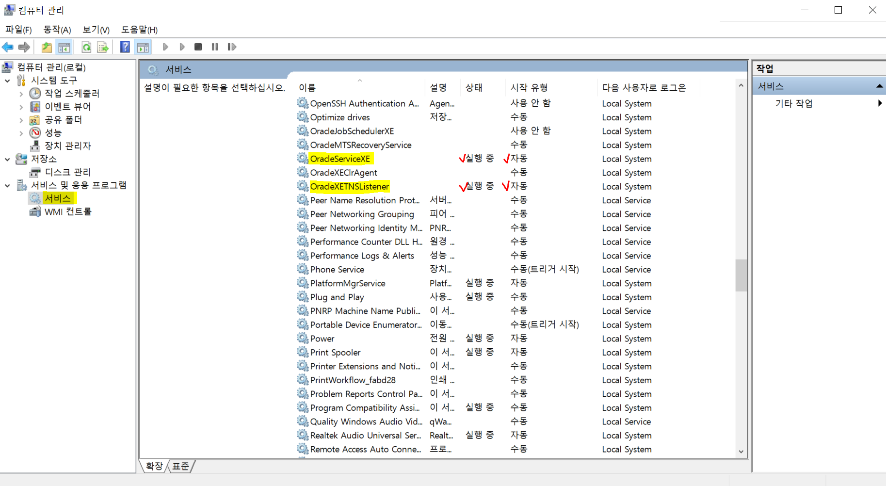 그리고 OracleServiceXE와 OracleXETNSListener가 실행중과 자동으로 되어있는지 확인한다.
