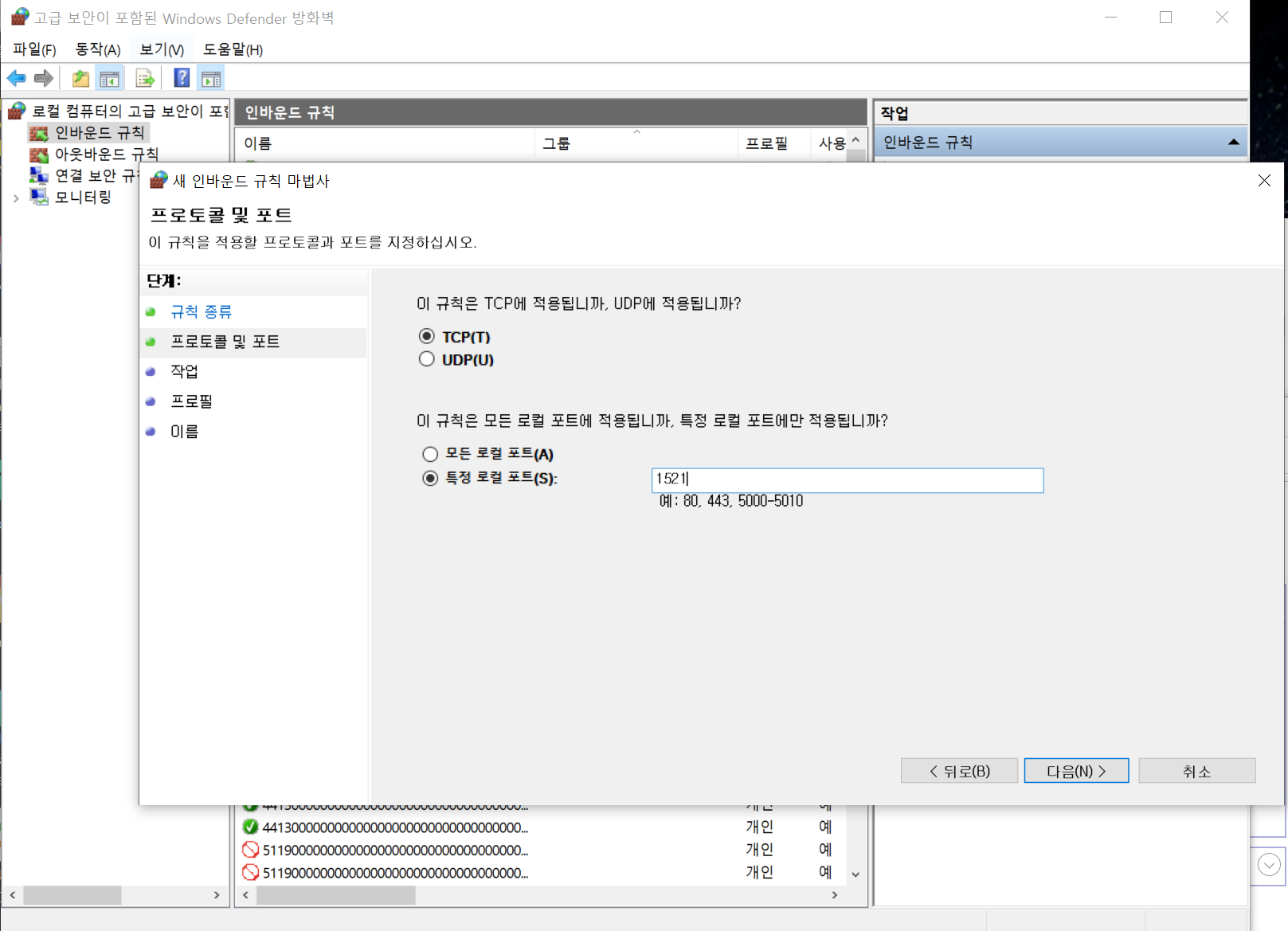 → 인바운드규칙 → 새규칙 → 포트 클릭 → 특정 로컬 포트 : 1521 입력 → 완료