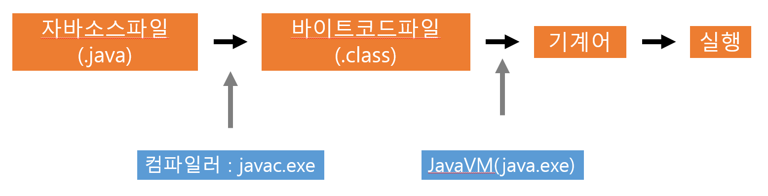 자바소스파일(.java) -> 바이트코드파일(.class) -> 기계어 -> 실행