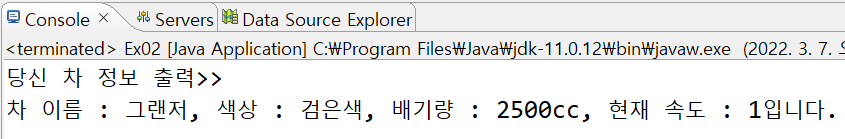 Ex02CarDesign yourCar = new Ex02CarDesign("그랜저", "검은색", 2500, 60);