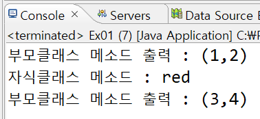 System.out.println("부모클래스 메소드 출력 : (" + x + "," + y + ")");