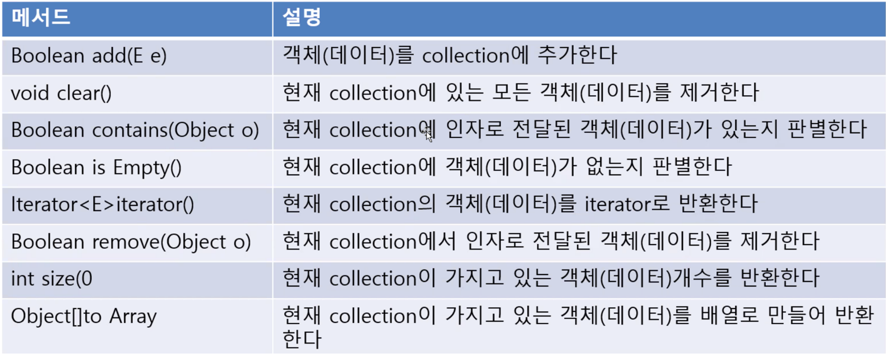 ▶ 자바 컬렉션(Collrection) 인터페이스에 선언된 추상 메소드
