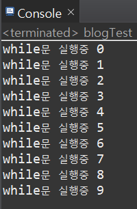 num이 10보다 작을 때까지 계속해서 실행되어 “while문 실행중"이 총 10번 출력되며,